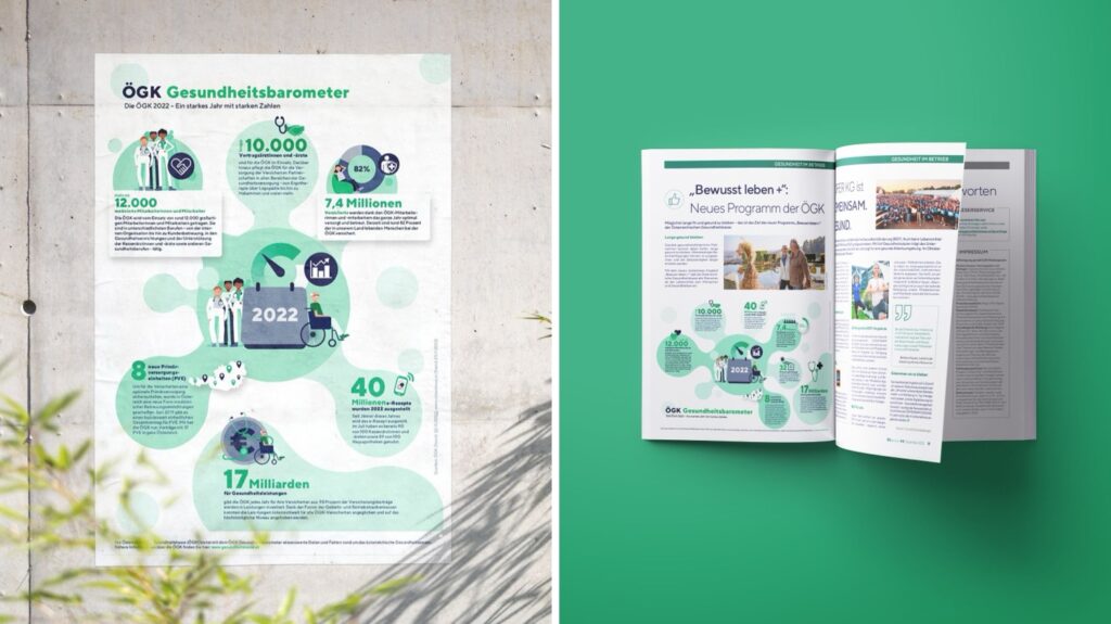 Je nach den im Kick-Off besprochenen Ausspielformaten, kann die Infografik jetzt vielseitig ein- und umgesetzt werden: Als Roll Up, Plakat, als Online Werbematerial oder in einer Broschüre – hier gibt es kaum Grenzen!